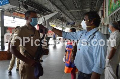 Photo Caption : Thermal Screening of security personnel being conducted by medical teams in the wake of deadly Coronavirus outbreak at Bengaluru City Railway Station, in Bengaluru on Monday 23rd March 2020
