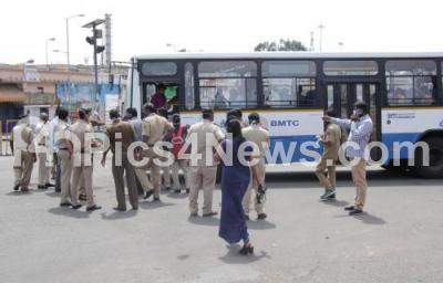 Emergency BMTC services at Majestic bus stand after lock down called by Indian Government amid rising Coronavirus cases, in Bengaluru on Thursday 26th March 2020