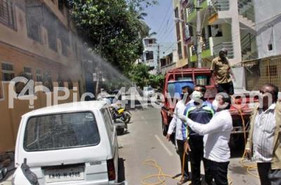 Photo Caption : BBMP workers spray disinfectant at Okalipuram to mitigate the spread of coronavirus, in Bengaluru on Monday 30th March 2020