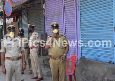 Photo Caption : Police security at Shivajinagar during the nationwide lockdown in the wake of novel coronavirus (COVID 19) pandemic, in Bengaluru on Saturday 4th April 2020