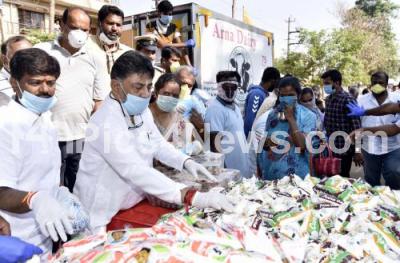 Photo Caption : KPCC Designated President DK Shivakumar and Arna Seva trust members distributed milk packets to the homeless and poor people at Yelahanka Railway station during the Coronavirus Lockdown, in Bengaluru on Sunday 5th April 2020