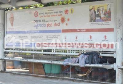 Photo Caption : A homeless man seen sleeping at a bus stop near BBMP head office during the nationwide lockdown in the wake of novel coronavirus (COVID 19) pandemic, in Bengaluru on Wednesday 8th April 2020