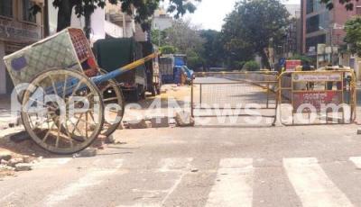 Photo Caption : VV Puram entrance road being closed with barricades during the nation wide lockdown in the wake of novel coronavirus (COVID-19) pandemic, in Bengaluru on Sunday 12th April 2020