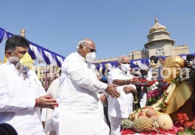 Chief Minister of Karnataka BS Yediyurappa with Congress Leaders DK Shivakumar and Mallikarjuna Kharge paying floral tribute the statue of Dr BR Ambedkar on the occasion his 129th birth anniversary at Vidhana Soudha, in Bengaluru on Tuesday 14th April 2020