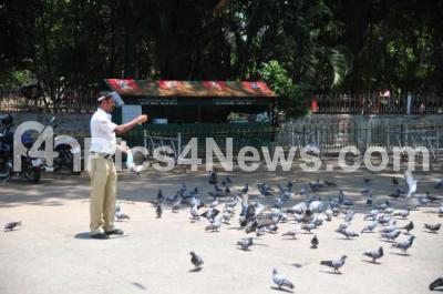 Photo Caption : A traffic policeman seen feeding the pigeons near Lalbagh gate during the nationwide lockdown in the wake of novel coronavirus (COVID 19) pandemic, in Bengaluru on Sunday 19th April 2020