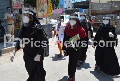 Photo Caption : Health workers seen at Padarayanapura ward in Chamrajpet Constituency as tension gripped in Padarayanapura locality after a gang of miscreants allegedly stormed a check - post and pulled it down completely besides destroying the barricades that were put up to seal the area as part of COVID 19 containment measures, in Bengaluru on Monday 20th April 2020