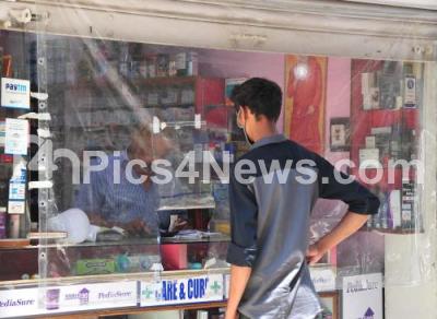 Photo Caption : Medical shop owner use plastic paper to cover the medical store as a precaution from Coronavirus , during the nationwide lockdown in the wake of novel coronavirus (COVID 19) pandemic, in Bengaluru on Thursday 23rd April 2020