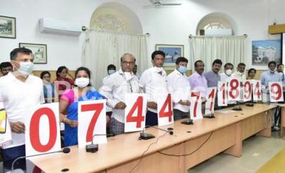 Mayor Goutham Kumar with Deputy Mayor Rajmohan Raju, BBMP Commissioner Anil Kumar and Councilors launching BBMP Tele Health line number at BMBP office , during the nationwide lockdown in the wake of novel coronavirus (COVID 19) pandemic, in Bengaluru on Thursday 23rd April 2020