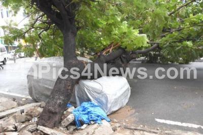 Photo Caption : A tree uprooted on a car at Manjunath Nagar due to heavy wind and rain in the city, in Bengaluru on Friday 24th April 2020