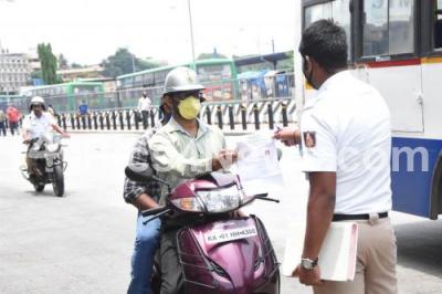 Photo Caption : Police check point at Majestic,during the nationwide lockdown in the wake of novel coronavirus (COVID 19) pandemic, in Bengaluru on Saturday 25th April 2020