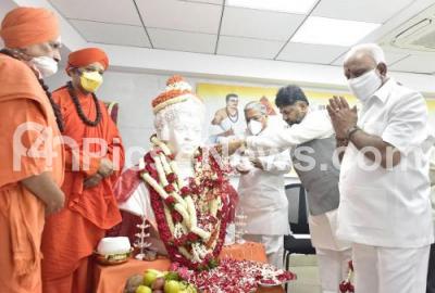 Photo Caption : Chief Minister of Karnataka BS Yediyurappa with DCM Govind Karjol, Home Minister Basavaraj Bommai, Congress Leader DK Shivakumar, Dr Shivamurthy Muruga Sharanaru and others paying floral tribute to statue of Sri Basavanna on the occasion of Basaveshwara Jayanti, in Bengaluru on Sunday 26th April 2020