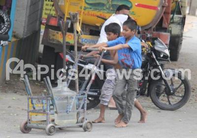 Photo Caption : Children carrying water at Magadi Road during the nationwide lockdown in the wake of novel coronavirus (COVID 19) pandemic, in Bengaluru on Sunday 26th April 2020