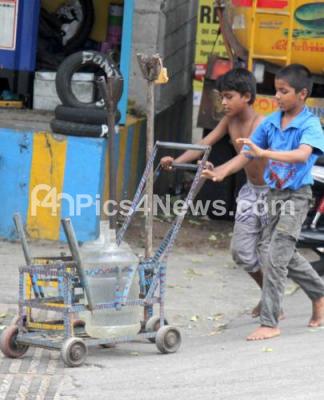 Children carrying water at Magadi Road during the nationwide lockdown in the wake of novel coronavirus (COVID 19) pandemic, in Bengaluru on Sunday 26th April 2020
