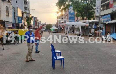 Photo Caption : Police use drones to track people movements at Lalbagh Fort Road near Mavalli during the nationwide lockdown in the wake of novel coronavirus (COVID 19) pandemic, in Bengaluru on Sunday 26th April 2020