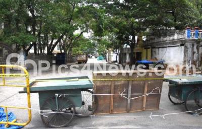 Photo Caption : JC Road cross area road being closed to contain Coronavirus during the nationwide lockdown in the wake of novel coronavirus (COVID 19) pandemic, in Bengaluru on Monday 27th April 2020