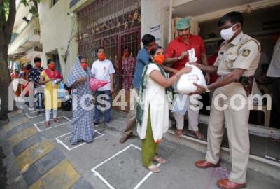 Photo Caption : Free food items being distributed to homeless and poor people at Someshwara Nagar during coronavirus lockdown, in Bengaluru on Thursday 30th April 2020