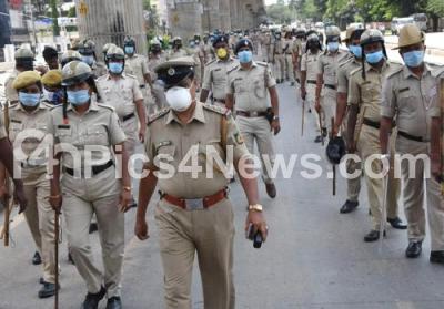 Photo Caption : Police personnel flag march at Goruguntepalya and Yeshwanthapura during the nationwide lockdown in the wake of novel coronavirus (COVID 19) pandemic, in Bengaluru on Friday 1st May 2020