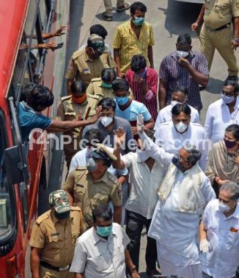KPCC President DK Shivakumar with Congress leaders Siddaramaiah, Dinesh Gundu rao and others interact with the stranded people at Majestic Bus Stand, as the government eased restrictions on travel to help stranded people reach their homes, during ongoing Coronavirus lockdown, in Bengaluru on Sunday 3rd May 2020
