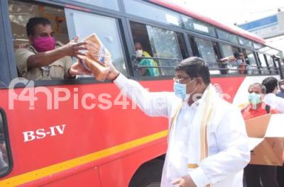 Photo Caption : Minister Gopalaiah distributed bread packets to the migrant workers workers as the government eased restrictions on travel to help stranded people reach their homes, during ongoing Coronavirus lockdown, in Bengaluru on Tuesday 5th May 2020