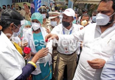 Medics and Asha workers being honored by DCM Laxman Savadi with flower petals for their services at Majestic Bus Stand during the nationwide lockdown in the wake of novel coronavirus (COVID 19) pandemic, in Bengaluru on Wednesday 6th May 2020