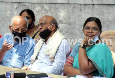 Joint Committee on Trade Unions leaders Shantakumar, Anantha Subbarao, Varalakshmi and others addressing a press conference, in Bengaluru on Saturday 9th May 2020