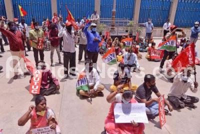 Event Description : Members of AIUTUC staging a protest at Bannerghatta Road to press their various demands ,during the nationwide lockdown in the wake of novel coronavirus (COVID 19) pandemic, in Bengaluru on Monday 11th May 2020