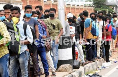 Stranded people of Odisha standing in the queue at Palace Grounds for registration to reach their native places, after the government eased the nationwide lockdown imposed as a preventive measure against the COVID 19 coronavirus, in Bengaluru on Saturday 16th May 2020
