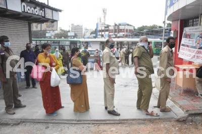 Photo Caption : KSRTC staffs standing in the queue for thermal screening test at Majestic bus stand, as KSRTC gears up to resume its operation, amid ongoing Coronavirus lockdown, in Bengaluru on Tuesday 19th May 2020