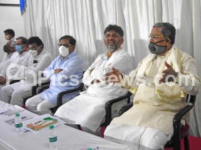Photo Caption : KPCC President DK Shivakumar with Congress Leader Siddaramaiah, Former DCM Dr Parameshwar and others Karnataka Congress leaders seen at the Congress Legislative Party meeting, in Bengaluru on Tuesday 19th May 2020