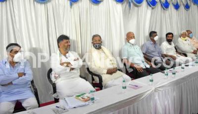 KPCC President DK Shivakumar with Congress Leader Siddaramaiah, Former DCM Dr Parameshwar and others Karnataka Congress leaders seen at the Congress Legislative Party meeting, in Bengaluru on Tuesday 19th May 2020