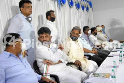KPCC President DK Shivakumar with Congress Leader Siddaramaiah, Former DCM Dr Parameshwar and others Karnataka Congress leaders seen at the Congress Legislative Party meeting, in Bengaluru on Tuesday 19th May 2020