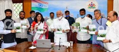 Photo Caption : CM BS Yediyurappa releasing a souvenir book on the occasion of World Environment Day, also seen are Home Minister Basavaraj Bommai, Ministers Anand Singh, CT Ravi and others at home office Krishna, in Bengaluru on Friday 5th June 2020