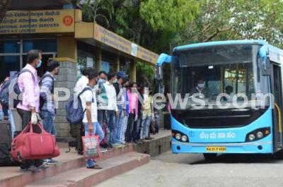 Passengers seen boarding buses to Kemepgowda International Airport at Majestic Bus Stand, amid Coronavirus Lockdown, in Bengaluru on Friday 5th June 2020