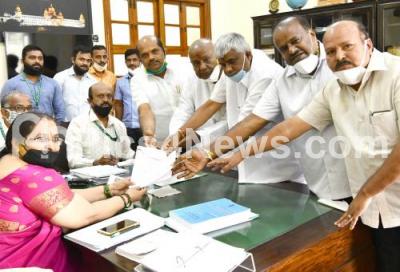 Photo Caption : JDS Rajya Sabha candidate HD Devegowda filing his nomination papers for the Rajya Sabha seat in the presence of JDS State President HK Kumarswamy, JDS Leaders HD Kumarswamy, HD Revanna and Bandeppa Kashempur at Vidhana Soudha, in Bengaluru on Tuesday 9th June 2020