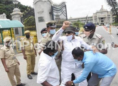 Vatal Nagaraj being detained by police at Vidhana Soudha during a protest against SSLC exam, in Bengaluru on Thursday 11th June 2020