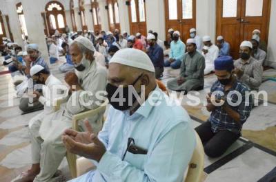 Photo Caption : Muslims gathered to offer prayers on the first friday after reopening of religious places of worship, while maintaining social distancing at Jamia mosque, KR Market, during the fifth phase of ongoing COVID 19 Coronavirus lockdown, in Bengaluru on Friday 12th June 2020