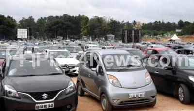 Christian community offer prayers adhering to social distancing norms, sing and pray while sitting in their cars after parking them on a ground during drive in worship, amid the ongoing COVID-19 lockdown, in Bengaluru on Sunday 14th June 2020