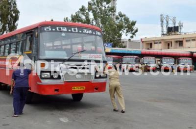 Photo Caption : KSRTC workers seen pushing the broken down KSRTC bus at Majestic bus stand, in Bengaluru on Tuesday 16th June 2020
