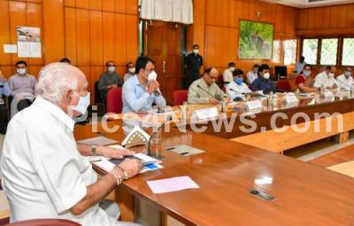 Photo Caption : Chief Minister of Karnataka BS Yediyurappa with DCM Dr Ashwath Narayan and officials of Department of Information Technology, Biotechnology, Science and Technology held a progress review meeting at home office Krishna, in Bengaluru on Wednesday 17th June 2020