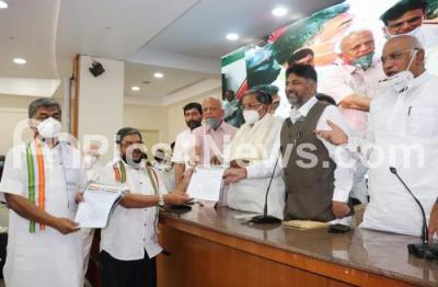 Photo Caption : Congress MLC candidates BK Hariprasad and Nazeer Ahamed receiving B Form from KPCC State President DK Shivakumar and CLP Leader Siddaramaiah at KPCC office, also seen are Congress leader Mallikarjuna Kharge, S R Patil and others, in Bengaluru on Thursday 18th June 2020