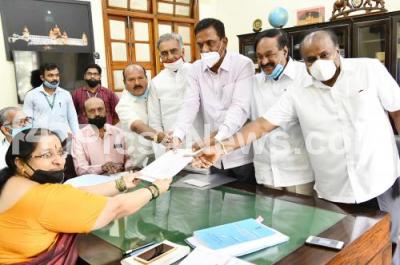Photo Caption : JDS MLC candidate Inchara Govindraj filing his nomination papers for the MLC seat in the presence of JD(S) State President HK Kumarswamy, JDS Leaders HD Kumarswamy, Srinivasa Gowda, Bsavaraj Horatti at Vidhana Soudha, in Bengaluru on Thursday 18th June 2020