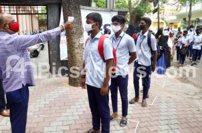Photo Caption : Students undergo thermal screening as they arrive to appear in the 12th standard (II PUC) board exam at Exam centre, during the fifth phase of nationwide COVID-19 Coronavirus lockdown, in Bengaluru on Thursday 18th June 2020
