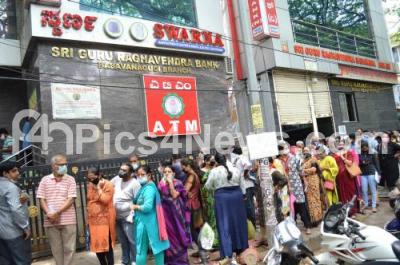Event Description : Customers of Sri Guru Raghavendra Bank, standing in a long queue to collect coupons to withdraw their own money from their accounts at Guru Raghavendra Bank, Basavanagudi, during the fifth phase of nationwide COVID-19 lockdown, in Bengaluru on Saturday 20th June 2020