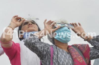 Photo Caption : People look up at the sun wearing protective glasses and use different filters to watch the sun form a crescent during Solar Eclipse, in Bengaluru on Sunday 21st June 2020