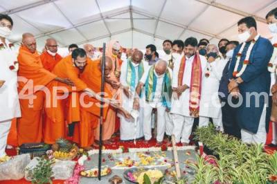 Photo Caption : CM BS Yediyurappa with Former PM HD Devegowda, KPCC Designated President DK Shivakumar, Sri Shivarathri Deshikendra, Nirmalanandanatha Swamiji and others at the inauguration of laying foundation stone for the 108 feet tallest Kempegowda statue on the occasion of 511th Naadaprabhu Kempegowda jayanti celebrations at BIAL, in Bengaluru on Saturday 27th June 2020