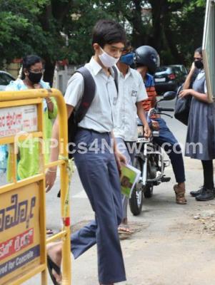 Photo Caption : SSLC students with protective masks seen arriving at the Exam centre to appear for the SSLC exam at Malleshwarm, in Bengaluru on Wednesday 1st July 2020
