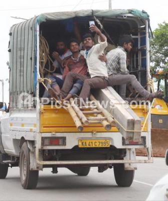 Photo Caption : Goods vehicle carrying labourers and steel pillars without safety measures, during the fifth phase of nationwide COVID-19 Coronavirus lockdown, in Bengaluru on Saturday 4th July 2020