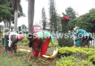 Photo Caption : Gardeners busy at Ambedkar Veedhi road, in Bengaluru on Friday 10th July 2020
