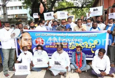 Photo Caption : Members of Dalit Okkuta protesting against state government and Amendment to the Land Reform Act, the protest was held at SBM Circle, in Bengaluru on Friday 10th July 2020