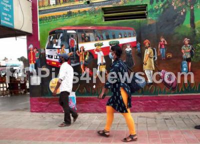 Commuters arriving at KSRTC bus stand to reach their native places, in Bengaluru on Saturday 11th July 2020